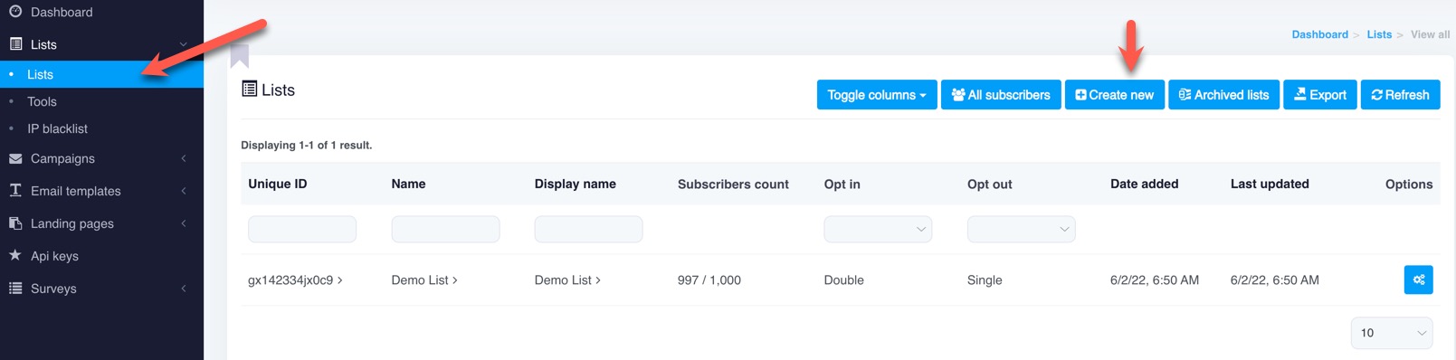 To send Email campaigns, you'll need to create an Email list if you haven't already. Your Email list identifies you as a sender, it contains your information and allows you to set options for your subscribers. Each list is completely separate, which means you can customise each list as you wish, including subscribers, custom forms/pages and custom fields.