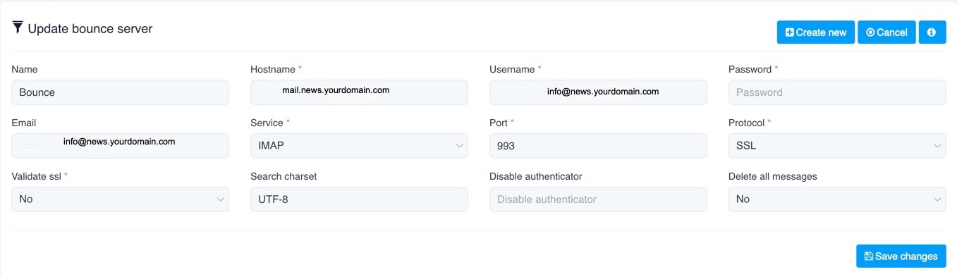 - Ensure that the Email you use in the "Email" setting is the one you set up for this purpose, in our example it is info@news.yourdomain.com .