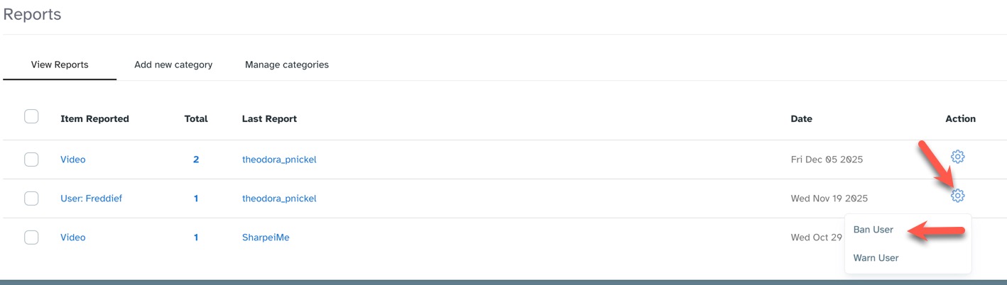 To the far right of the reported user, in the Action column, click the gear and select "Ban User."