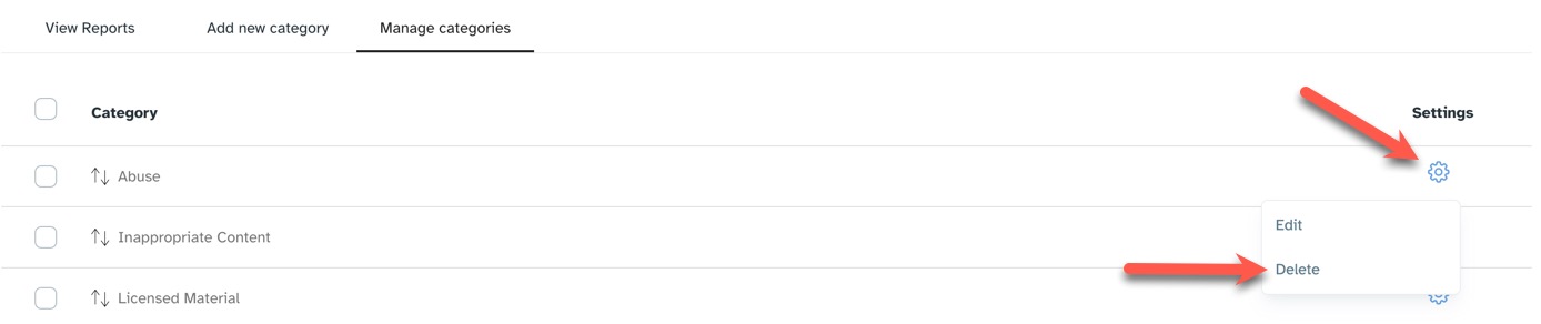 Click the gear to the far right of the category you want to delete and choose "Delete" from the drop-down selection.