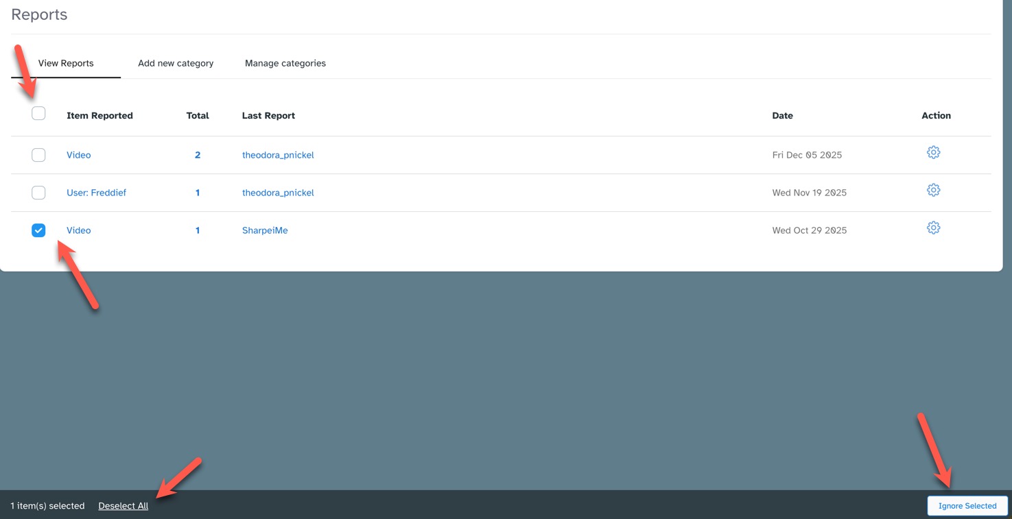 Click the checkbox to the left of the item(s) you want to ignore and choose "Ignore Selected" at the lower right of the screen. This will clear out this report. You can also mass select all reports by clicking the top left box, or deselect all by clicking the lower left "Deselect all."