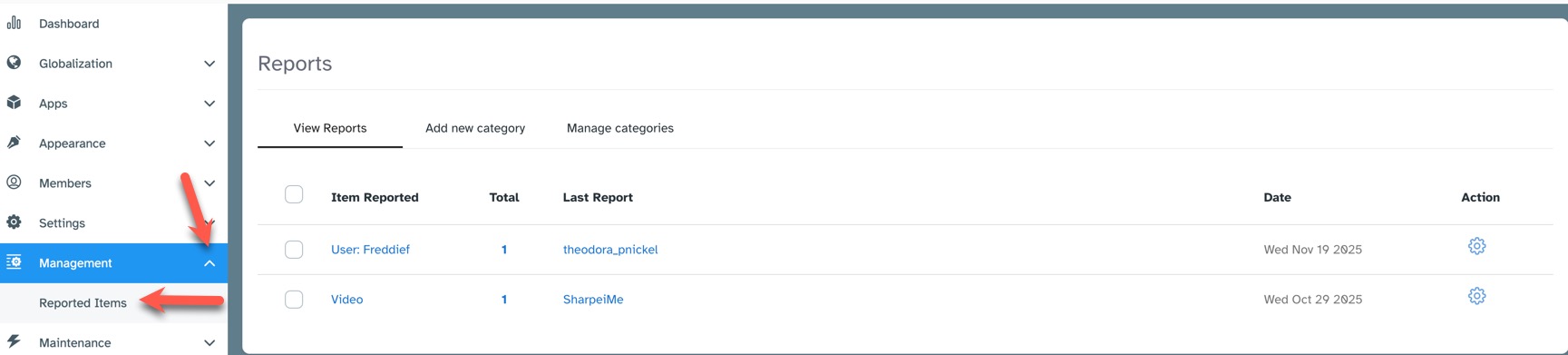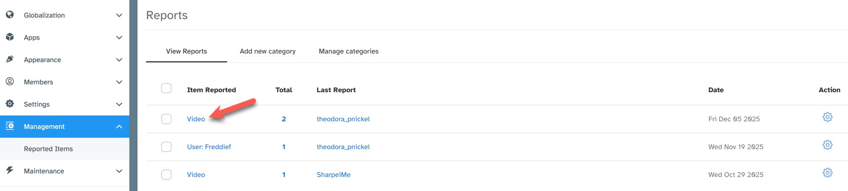 When viewing reports, you'll see the item reported, how many times it's been reported, and the date. You can click the item that's been reported to go to that item and take appropriate actions.