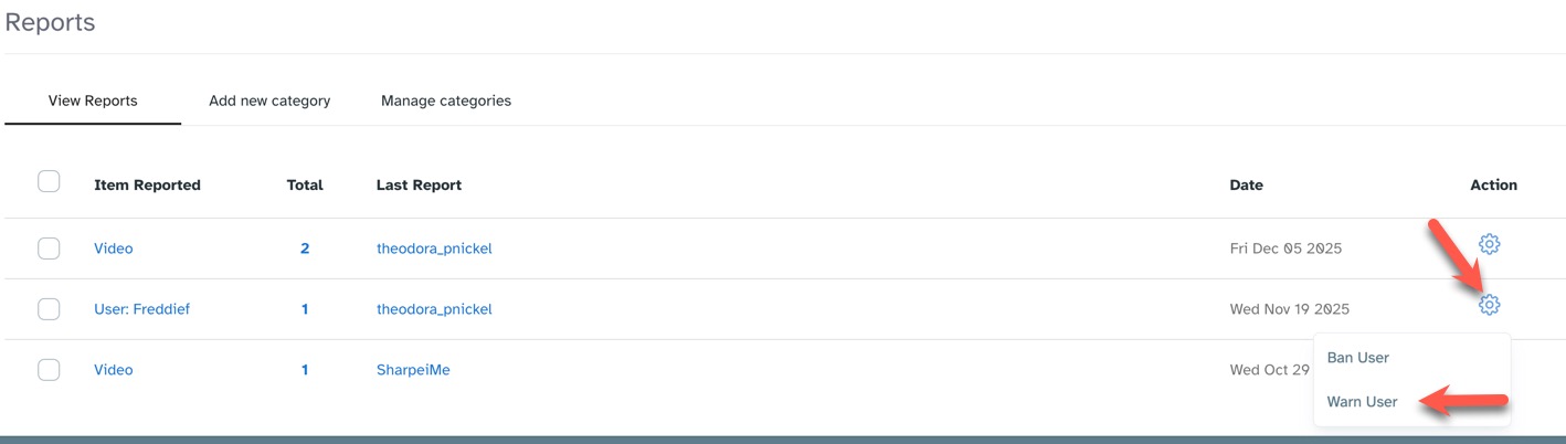 To the far right of the reported user, in the Action column, click the gear and select "Warn User."