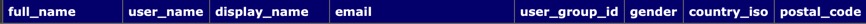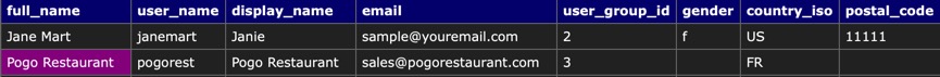 The example CSV file has column headers that must remain unchanged. They are: full_name, user_name, display_name, email, user_group_id, gender, country_iso, postal_code.
