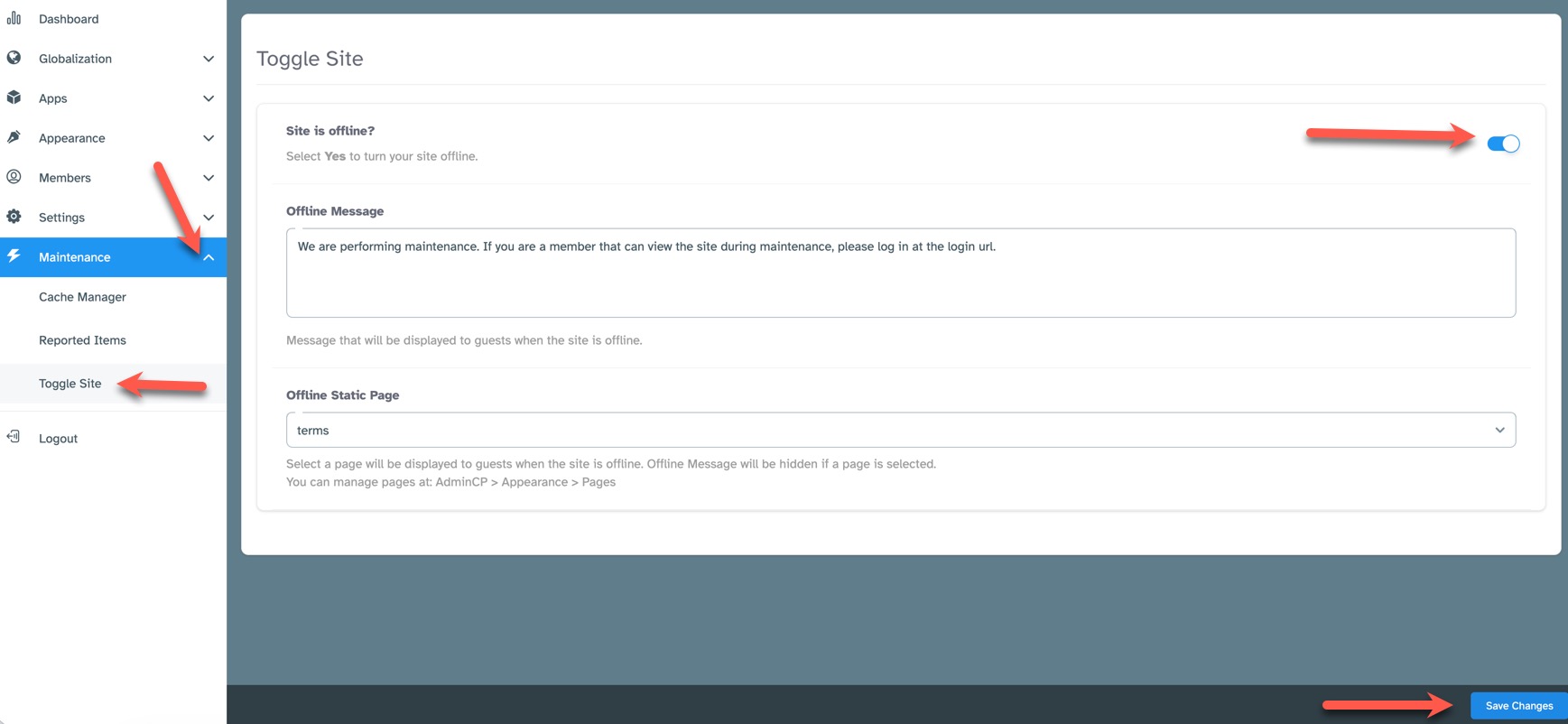 In order to set your site offline or online, you'll need to be logged in to your ACP.